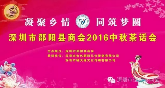 2016年9月3日(星期六),在深圳南山宝庆府大酒楼,深圳市邵阳县商会将举行商会全员中秋茶话会,共叙乡情,共享乡愁,共贺盛世中秋。