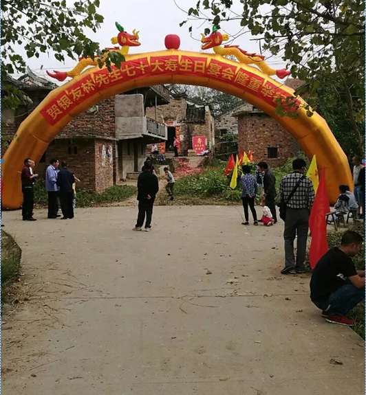 2016年10月2号,在这举国同庆的日子里,迎来了常务副会长银一鸣先生的老父亲银友林老人70大寿。得此消息,深圳市邵阳县商会的家人不远千里,也全然不顾大塞车的困拢,纷纷从深圳驱车赶回邵阳给银老爷子拜寿。回乡的商会家人们2号一早便在白仓镇汇合,统一贴上商会车标,在常务副会长唐志红的带领下,十几台车向夏溢村进军。老天也似乎为邵阳县商会家人如此团结一心,浓郁的乡情所感动,头两天还下小雨,今天亦是艳阳高照,秋高气爽。才至村口,就见张灯结彩,气球飘扬,两边旗帜开道,好不气派。所有的彩旗上均印有:你养我长大,我陪您变老!处处彰显了银总的一片孝心。